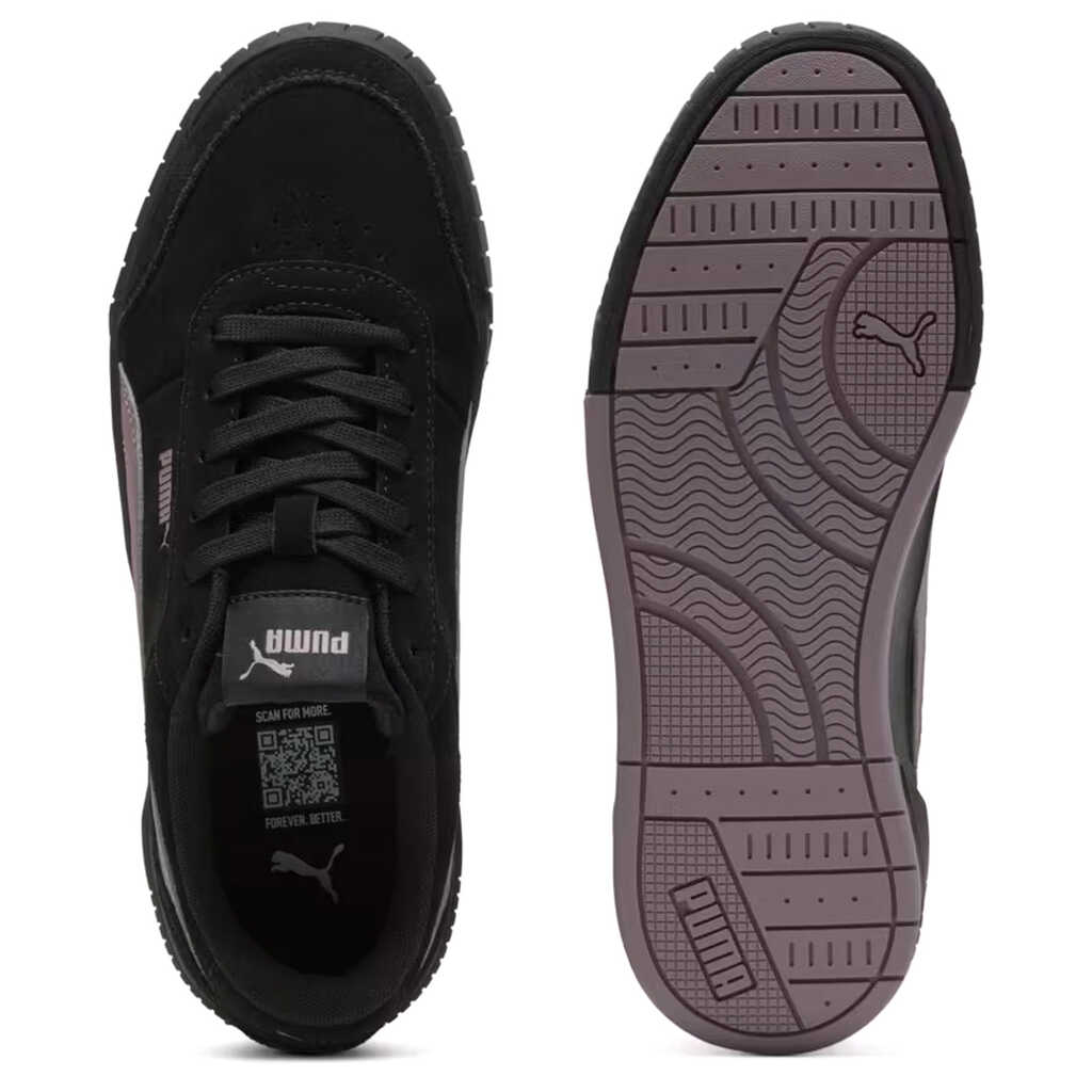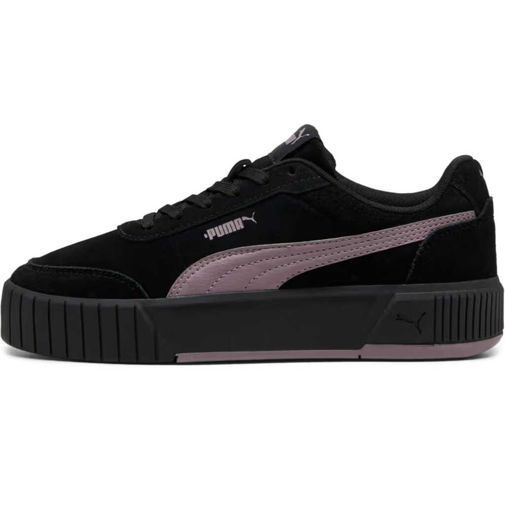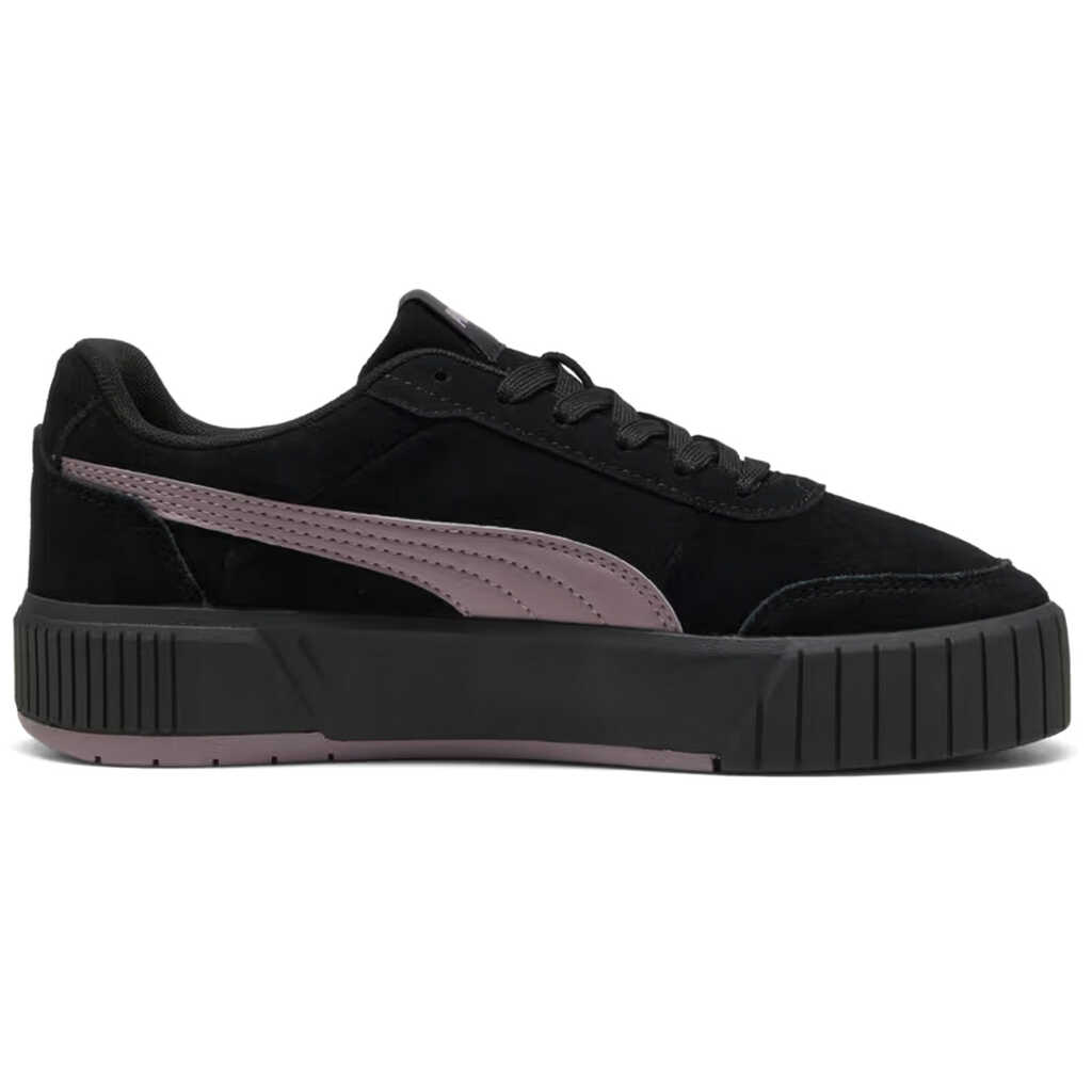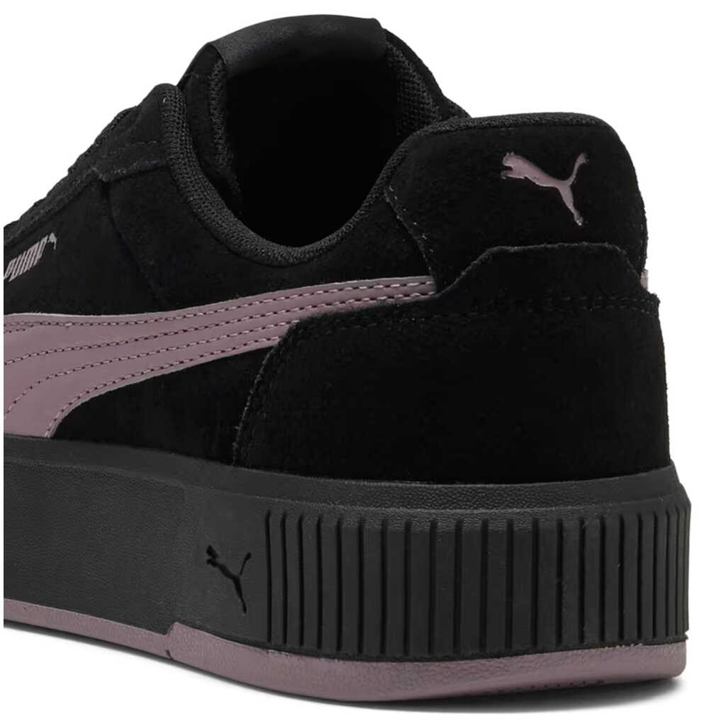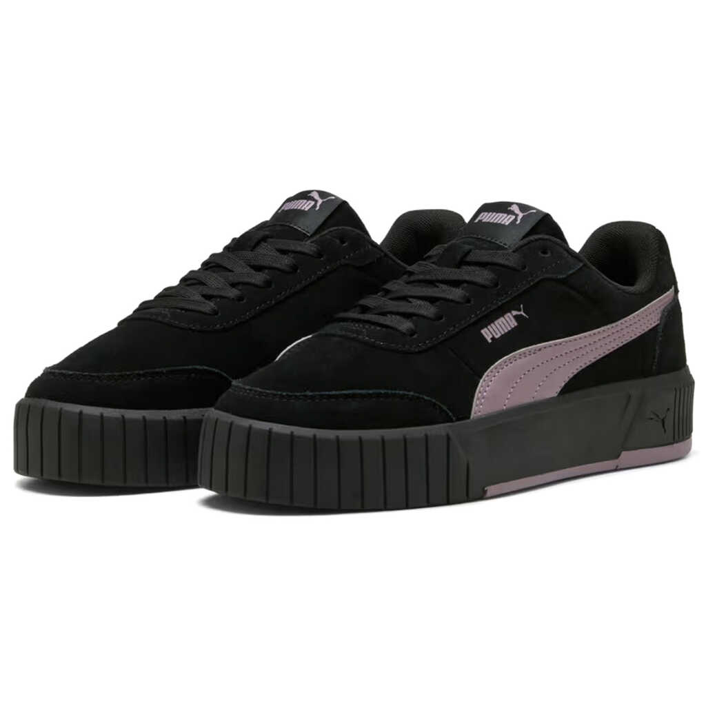 Puma Carina Mia SD PUMA Black-Plum Jam Carina Mia SD sneakers are a stylish take on a classic, combining a sporty character with a laid-back urban charm. Inspired by tennis aesthetics, they boast a fresh yet versatile design that fits seamlessly into the fast pace of everyday life. Comfort is ensured by the SOFTFOAM+ sockliner, which provides soft cushioning and a special heel pad. This ensures every step is effortless, providing additional support even during extended wear. The rounded toe and classic lace-up closure ensure a comfortable fit and secure support, perfect for everyday wear. The suede upper lends a sophisticated look and emphasizes its stylish versatility. A soft textile lining enhances the comfort. The high platform sole not only adds a modern touch but also enhances the silhouette while providing stability. The rubber outsole ensures reliable traction on a variety of surfaces and durability for everyday wear.