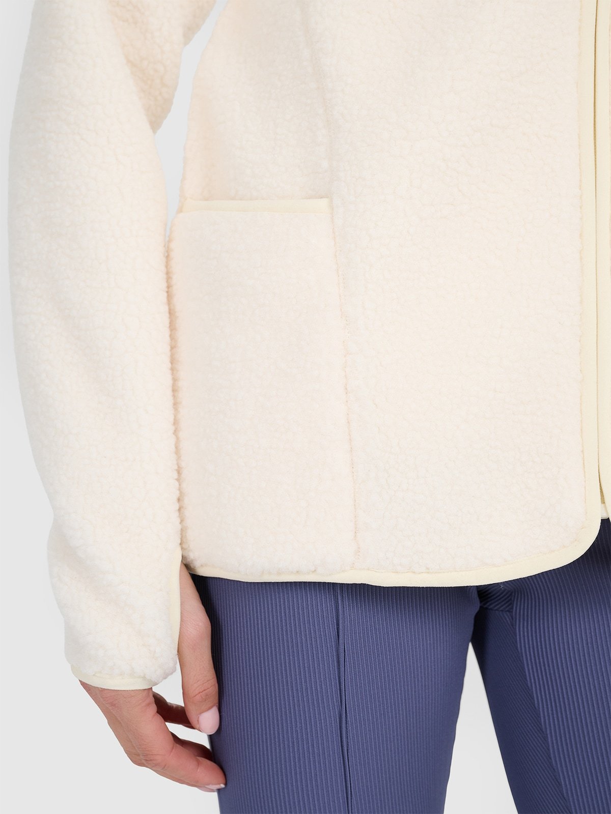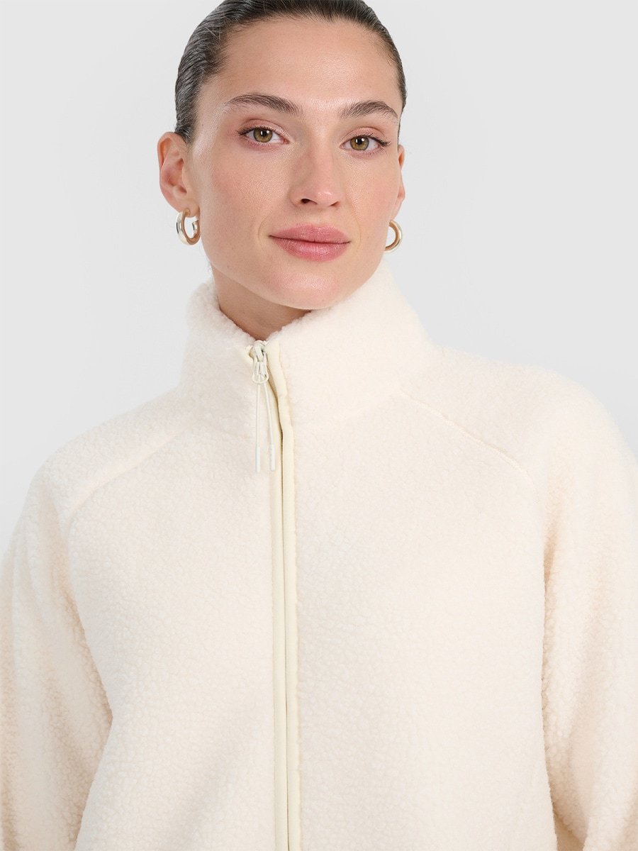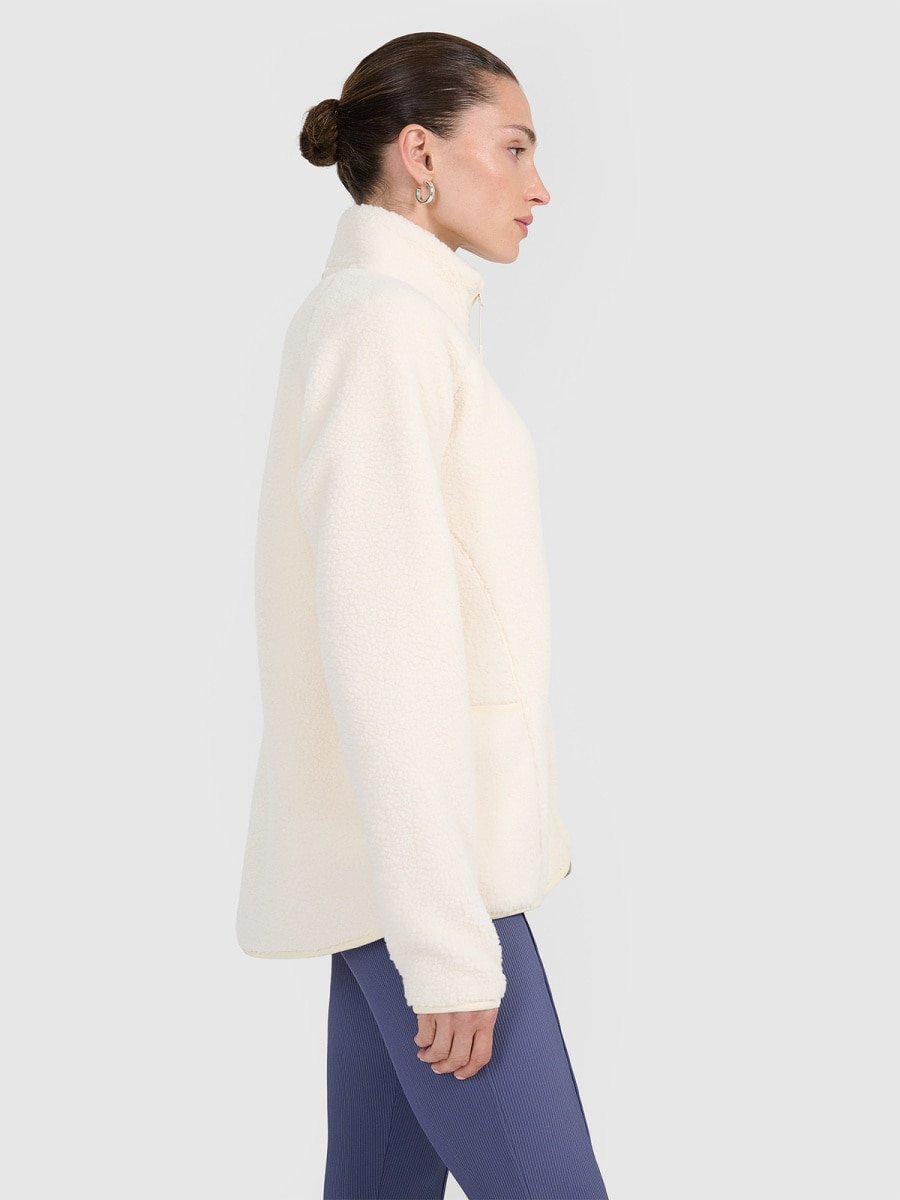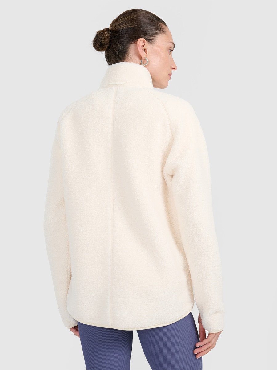 4F bieza sherpa flīsa jaka sievietēm. 4FWarm tehnoloģija palīdz uzturēt termisko komfortu zemākās temperatūrās, savukārt biezais, mīkstais sherpa materiāls nodrošina ievērojamu izolāciju un patīkamu maiguma sajūtu uz ādas. Brīvs fasons garantē kustības brīvību bez spiediena sajūtas, un pagarinātā aizmugurēja daļa labāk aizsargā muguras lejasdaļu aukstās dienās. Stāvapkakle zem kakla aizsargā kaklu no aukstuma un vēja. Piedurknes ar īkšķu caurumiem nodrošina papildu roku aizsardzību, savukārt elastīgā apdare aprocēs un apakšējā daļā palīdz saglabāt siltumu. 2 sānu kabatas glabās sīkus priekšmetus vai sasildīs rokas, un plakanās šuves samazina nobrāzumu risku un palielina valkāšanas komfortu.