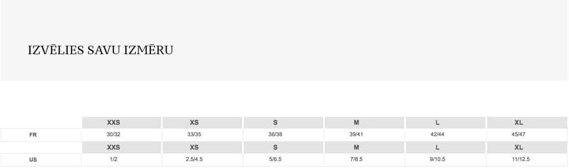 XXS 30-32 XS 33-35 S 36-38 M 39-41 L 41-44 XL 45-47