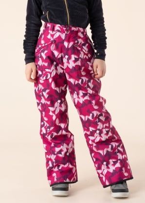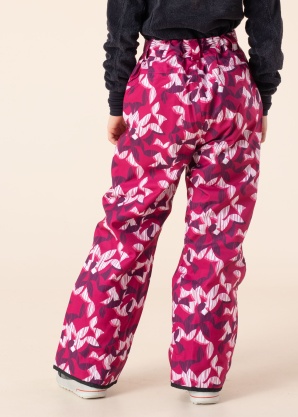 Catmandoo Dahy jr padded ski pant, P pink oxalis printed Catmandoo ski pants for children with CMD TECH HYDRO membrane. They feature a water-repellent, windproof, and breathable surface. They offer water-repellent properties up to 5000 mm, and breathability up to 5000 g/m²/24H. All seams are taped. These lightweight winter pants feature a snap button and zipper closure. The waistband is adjustable with side Velcro fasteners.