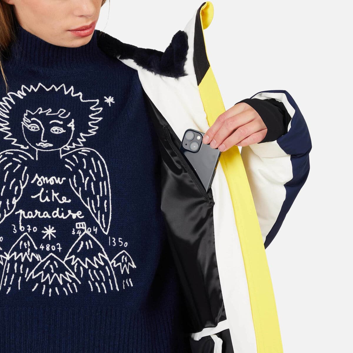 Let your style take flight in the women’s Rossignol JCC Valdiz Down Ski Jacket, a waterproof ski jacket that lights up the slopes with iconic angel designs from French fashion legend Jean-Charles de Castelbajac. On snowy days, it keeps you sheltered with waterproof coverage plus the unbeatable warmth of natural down insulation. Four-way stretch means ultimate comfort through all your groomer laps and mogul runs. You get plenty of pockets to store your pass, phone and other ski-day essentials.
