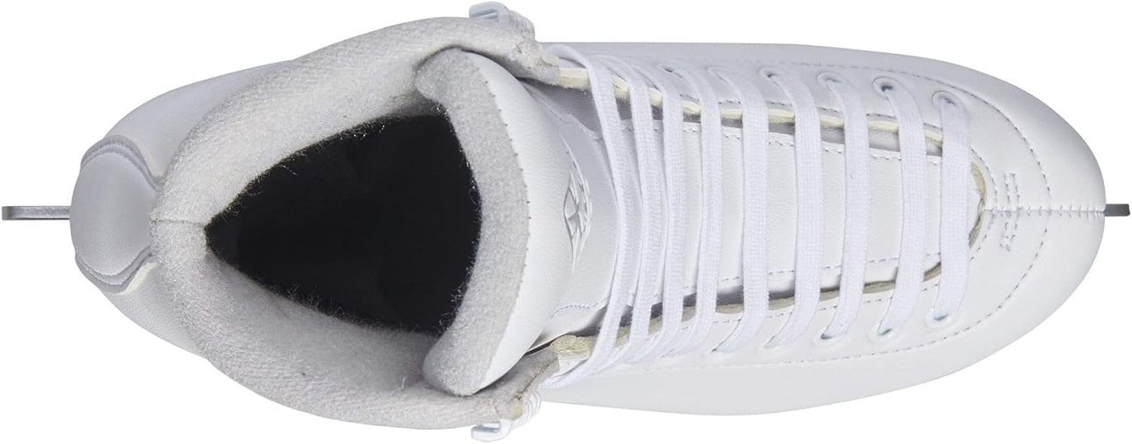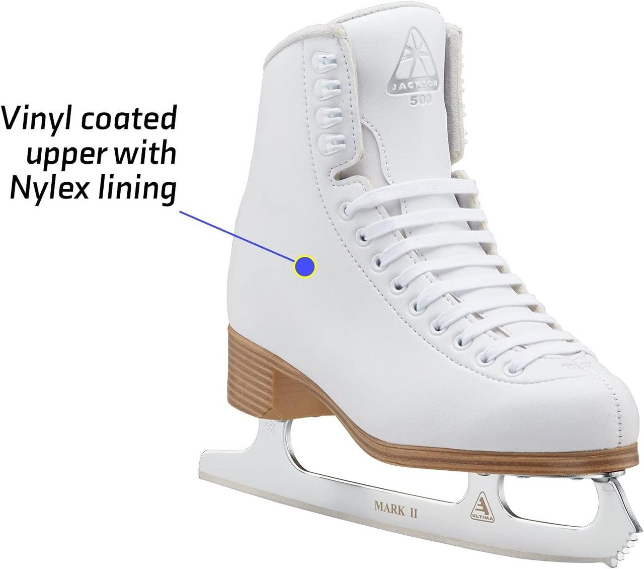 Jackson Jackson JC500 W Medium Recreational Support for stepping into advance level. MEDIUM SUPPORT FOR BEGINNING/INTERMEDIATE SKATERS – Classic 500 skates are equipped with medium recreational support, perfect for beginner skaters thinking about advancing into lessons. REINFORCED BOOT – The boot is made from reinforced vinyl coated uppers (with extra reinforcements) and has a multitude of comfort and fit-enhancing features throughout, including a hygienic Nylex lining, memory foam padding, a flex notch and rolled collar at the ankle, and foam-backed mesh tongues. ULTIMA MARK II BLADE – Classic 500 skates feature a factory-sharpened Ultima Mark II figure blade which is durable for outdoor skating and appropriate for less aggressive maneuvers. The blade is attached with rivets to a stylized PVC outsole for easy care and security. SIZING INSTRUCTIONS: High performance skaters generally prefer a tighter fit while beginners generally prefer a looser fit. Place a blank sheet of paper against the wall and stand on it with your heel against the wall. Measure with a sock if you want space, no sock for a tighter fit. Mark your longest toe on the paper. Repeat for both feet. Take the longest heel-to-toe length and use the sizing chart image to match your measurement with an accurate size.