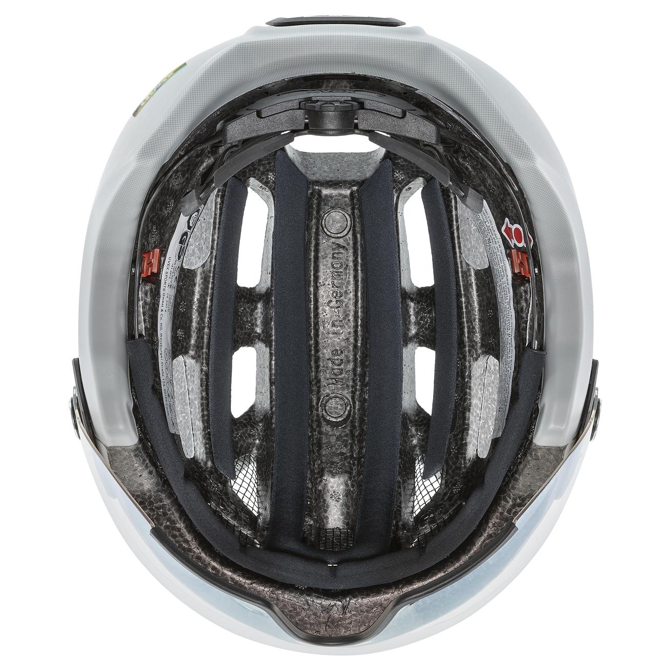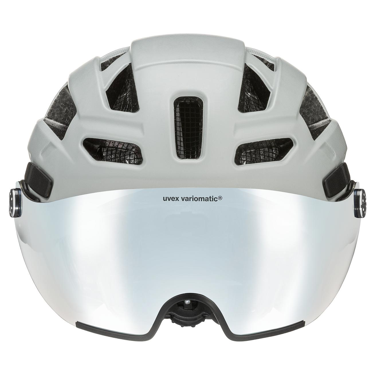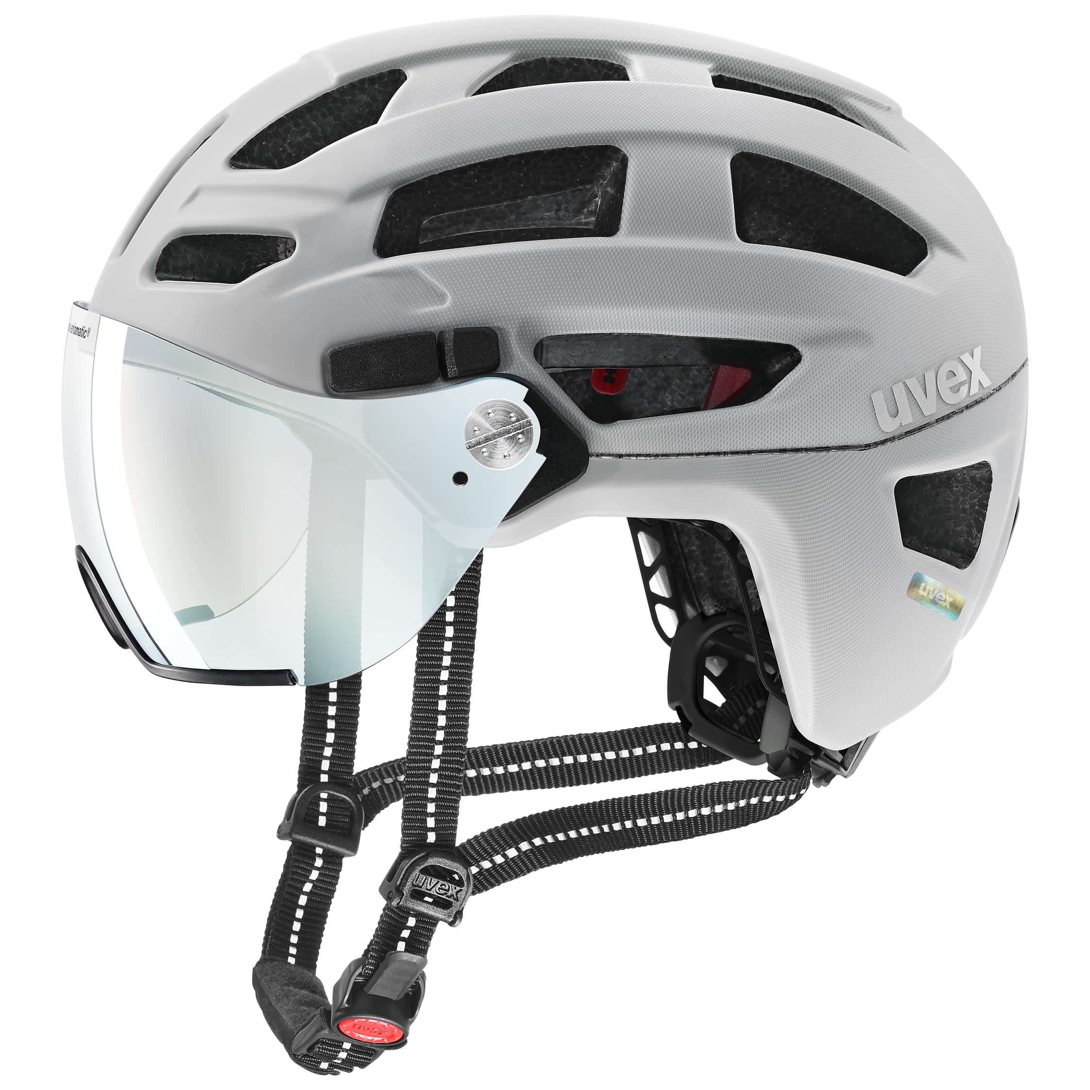 How can a first-class visor helmet be made even better? The answer is the uvex finale visor V. Our uvex variomatic® visor automatically adapts its tint – in two protection levels, cat. 1 and 2 – to the prevailing ing conditions. It also gives your eyes reliable protection against the sun’s glare, wind and dust. You’ll be impressed by this double inmould helmet with 19 ventilation openings and anatomic 3D IAS for a perfect fit. And by its clever features, like the integrated bug net, plug-in LED and reflective straps.