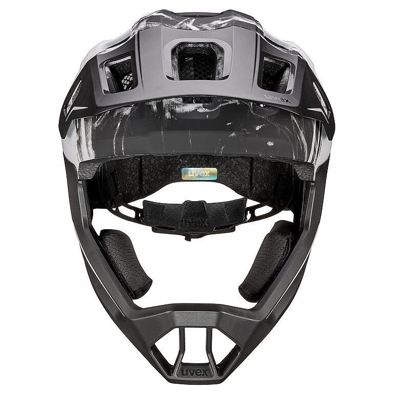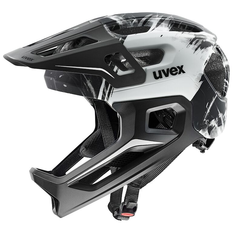 Action. Adventure. Adrenaline. The uvex react jr. fullface is the full-face helmet for action-packed groms. Whether it’s mountain biking trails, the pump track or at the skate park – this helmet is all about safety. That’s down to the inmould technology. An inseparable connection between the shock-absorbing EPS inner layer and a polycarbonate outer shell offers high impact protection at reduced weight, without compromising on safety. Special highlight: The easily removed chin guard with built-in, covered opening mechanism for added safety from external impact. The cheek padding can be repositioned using hook-and-loop nodes on the chin guard, to guarantee a snug fit. Just one hand free? No problem. The uvex monomatic buckle has one-handed operation and creates a secure, comfortable fit. The vent screens ensure that nothing but fresh air reaches their head when things are heating up. Full protection for bold kids: the uvex react jr. fullface.