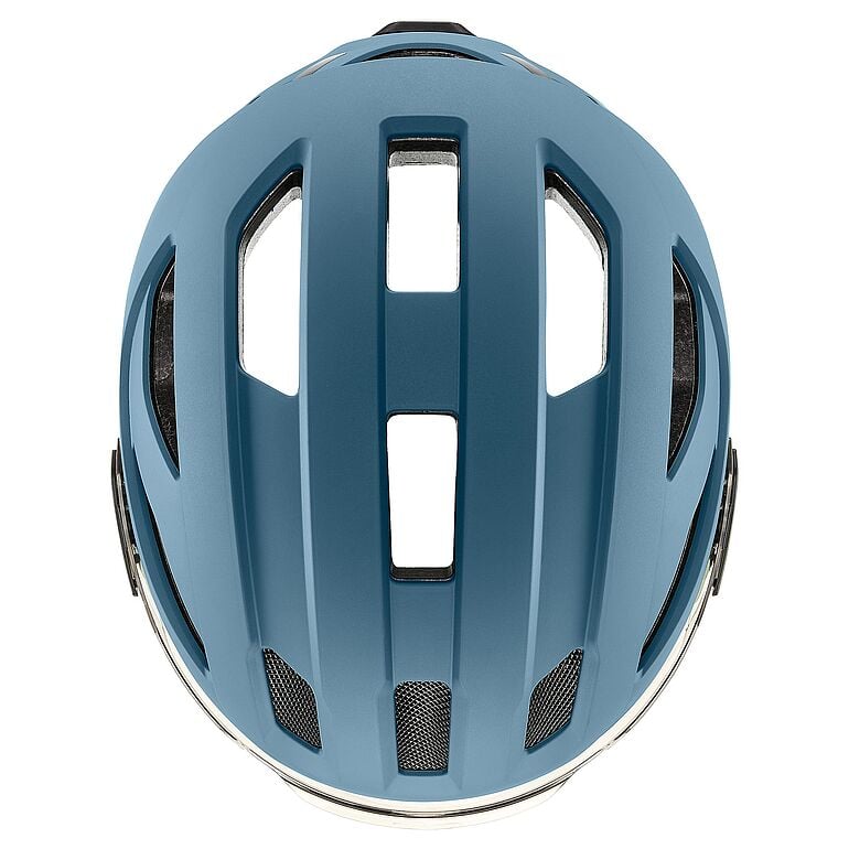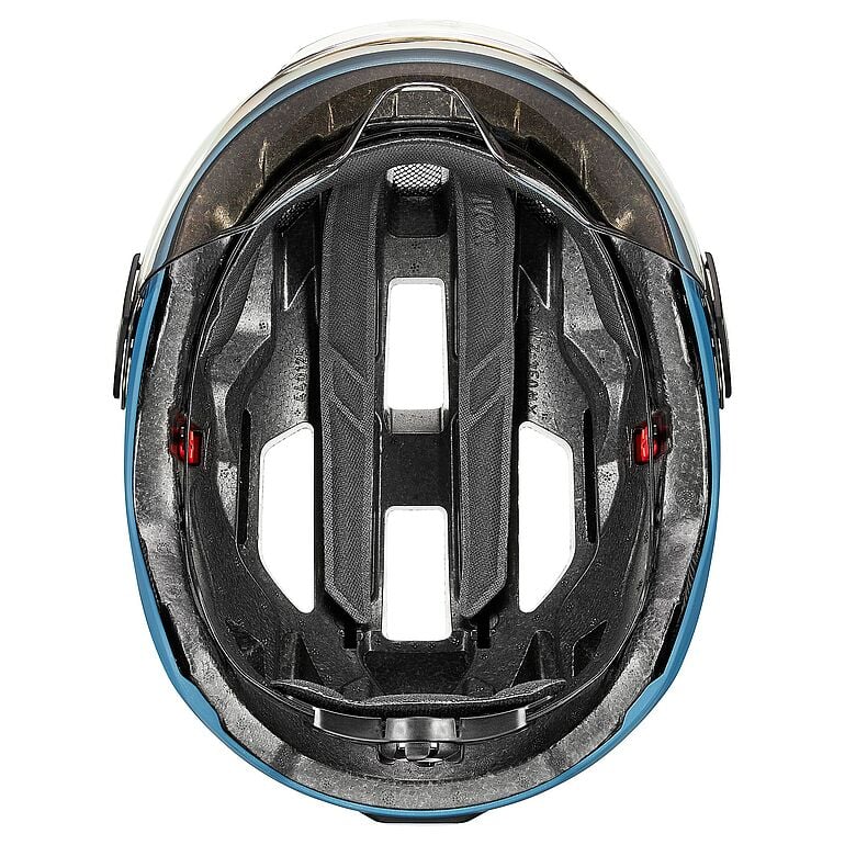Safe. Visible. Practical. It’s hard to find a better way to protect your head and eyes than the uvex stride visor. This visor helmet for commuting and city cycling is much more than a trendy accessory for an e-bike or hipster bicycle. Its hardshell construction with a plastic outer shell and lightweight EPS liner make it extremely impact resistant. And the lightly tinted, scratchproof visor offers the widest possible field of vision – which is important when negotiating urban traffic. The uvex stride visor can also be worn over prescription eyewear. A new-style bayonet mount means the lens is easily switched for a darker one or a clear one. And there’s a rain cap as an optional extra. Which prevents moisture from working its way between the visor and the helmet. A plug-in LED light at the back gives this commuter helmet added visibility in the dark. Further highlights: the uvex monomatic comfort buckle with one-handed operation. And there’s a docking slot for a lightweight Hiplok Z LOK security tie.