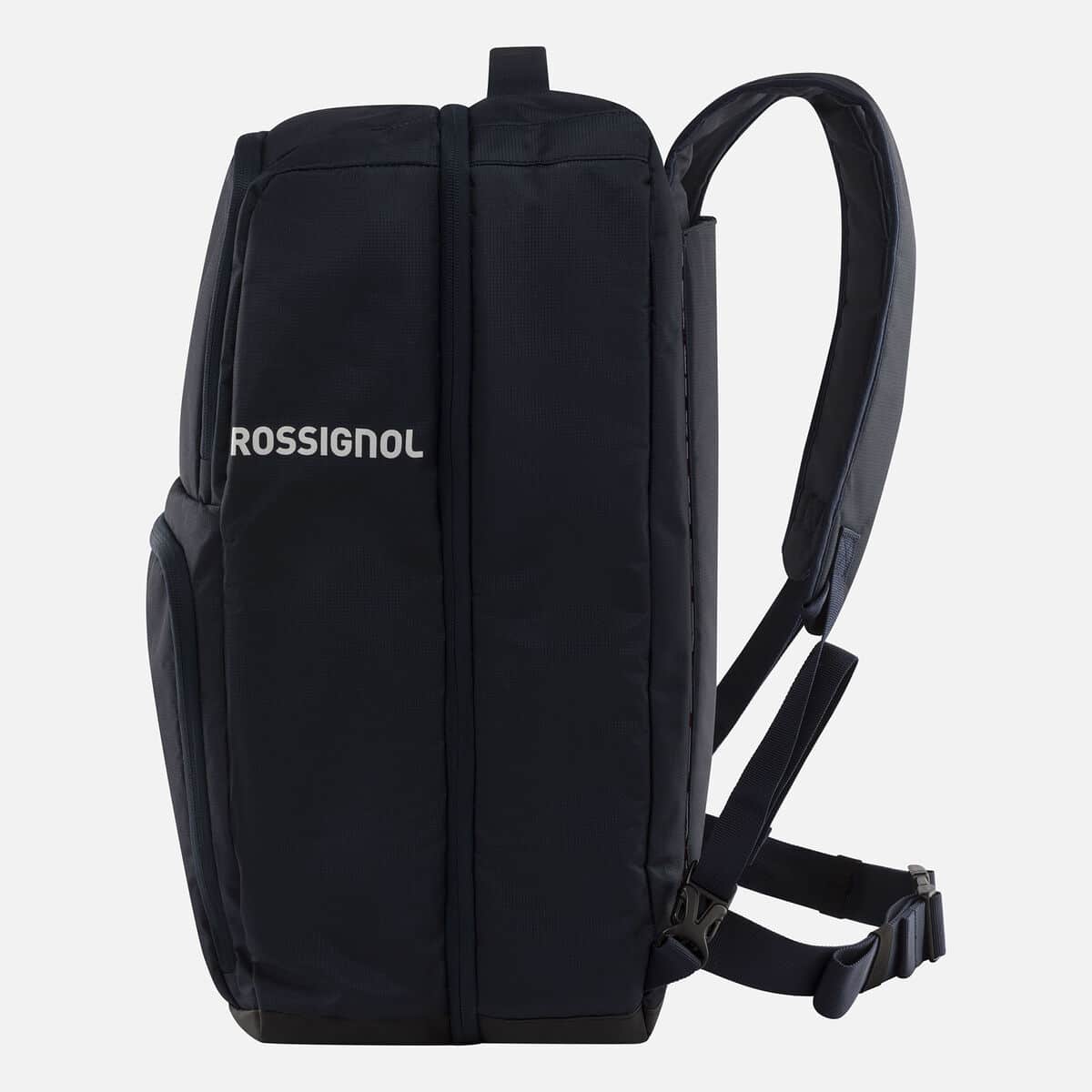 he Rossignol Strato Multi Boot Backpack is designed around traveling with ski gear. The clamshell design offers two separate main compartments to organize clothes, and two external pockets to organize smaller stuff for easy access. The inside is lined with water-resistant material, so you can keep wet boots or layers separated. Shoulder straps turn it into a backpack and free up your hands to carry your ski bag. While designed with ski gear in mind, it works great for all-around travel, too. The bag’s blue color and iconic tricolor stripes recall the legendary Strato ski legacy.