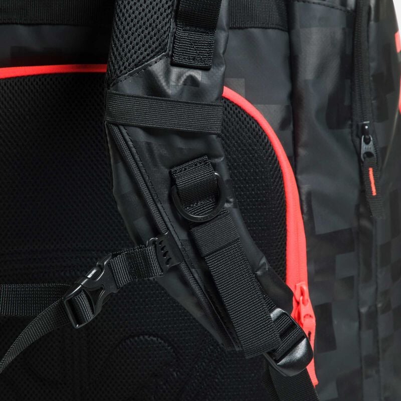 The Rossignol Hero Heated Athletes Bag is an extra-large, World Cup circuit-ready backpack with a built-in heater for warming and drying your gear. Made for hauling race-day gear in one organized bag, the pack has dedicated storage for ski boots, a helmet and goggles. Lined side compartments separate boots from other gear, while protective internal zones keep your helmet and goggles easy to grab. The massive main compartment has plenty of space for layers and other gear. Smaller zip pockets add organization. Weatherproof ripstop polyester and a waterproof tarpaulin bottom keep contents dry in all conditions.