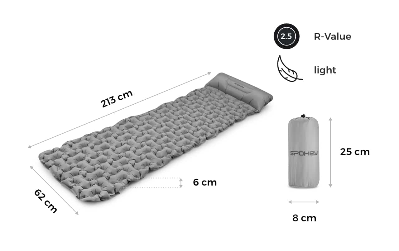 Izmēri pēc salocīšanas ir tikai 25x8x8 cm, tāpēc ietilps jebkurā somā, mugursomā vai koferī. Izmērs izklātā veidā: 213x62x6 cm; Īpaši viegls trekinga matracis